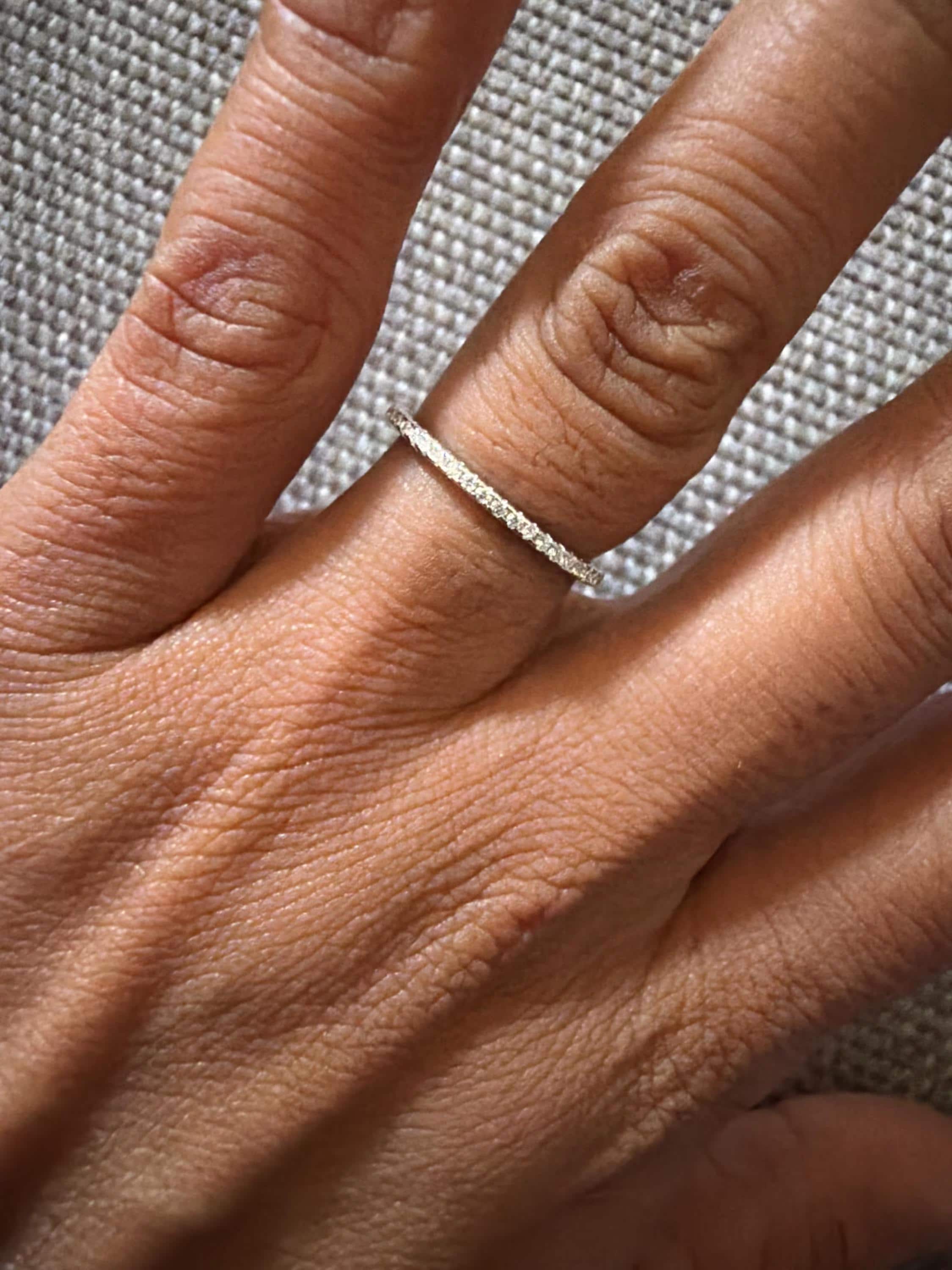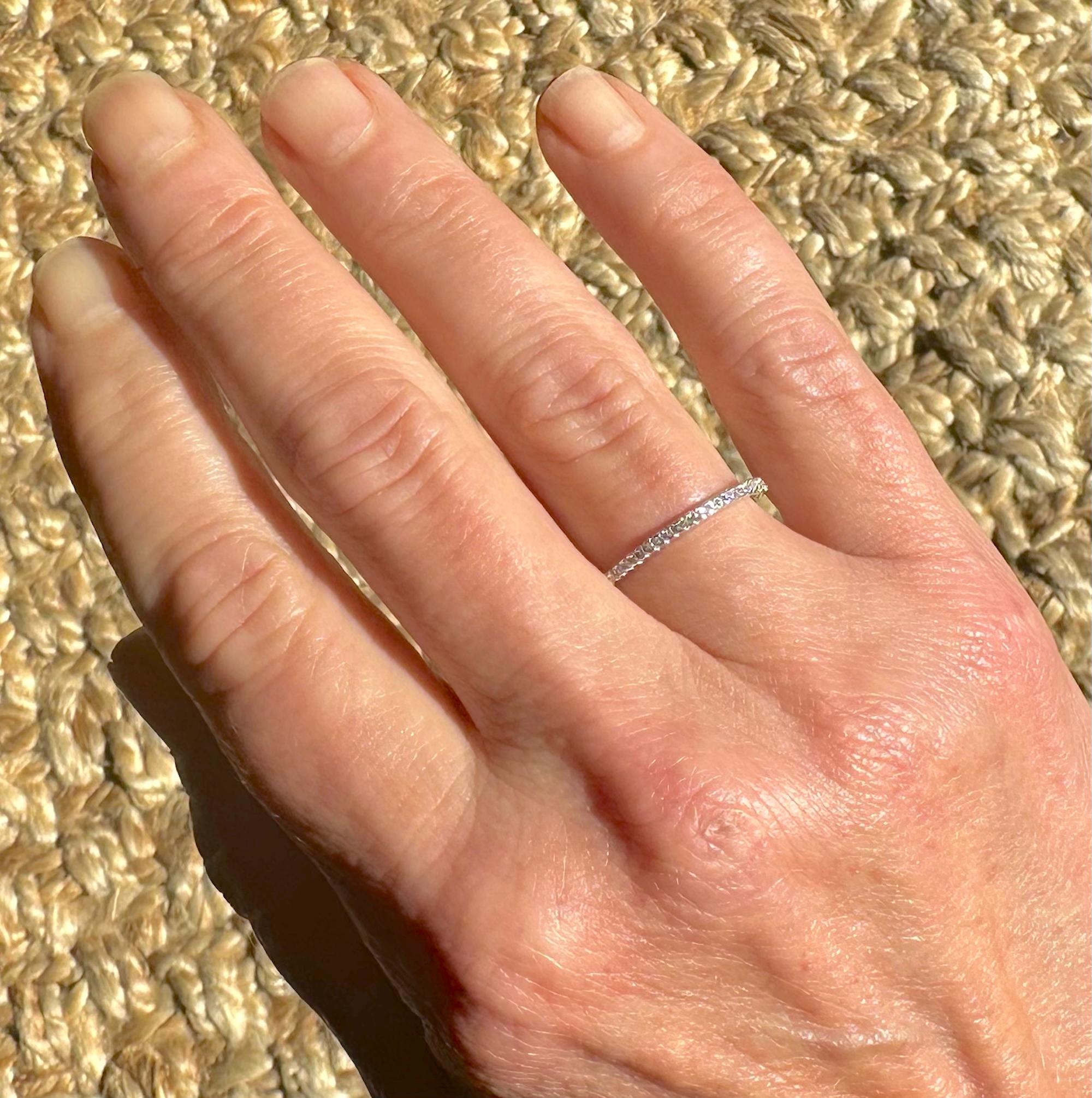 This extra petite half band is perfect for those who adore delicate stackable jewelry and want a ring that is extra thin. This ring showcases 1 mm clear cubic zirconia stones, meticulously set on a slender half band crafted from high-quality 925 sterling silver. The half bezel setting enhances both its style and comfort, making it an ideal choice for layering with other delicate pieces. Whether it's for daily wear or special occasions, this eternity band is a timeless addition to any outfit. Elevate your jewelry collection with this essential piece.