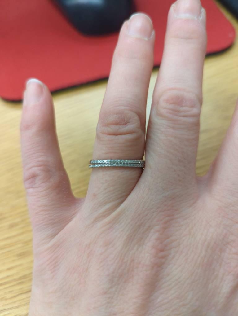 I LOVE how dainty and feminine this band is. I already owned several other full eternity bands of varying mm wide, but they just aren't what I'm "into" at the moment. I wanted the thinnest pavé band I could find, AT A REASONABLE PRICE, and this was it. I bought this ring and a few other full eternity bands from this seller at the same time. Ironically I like to wear them stacked sometimes, even though I'm not interested in wearing the other wider bands I already owned because they look "too wide" to me. These bands are seriously EXACTLY what I was looking for, at the right price. I shopped for quite some time before purchasing these because I wasn't about to pay $40 to $100 + for a sterling silver band with some sort of diamond simulant from other stores. The rings arrived quicker than I expected and were well packaged.